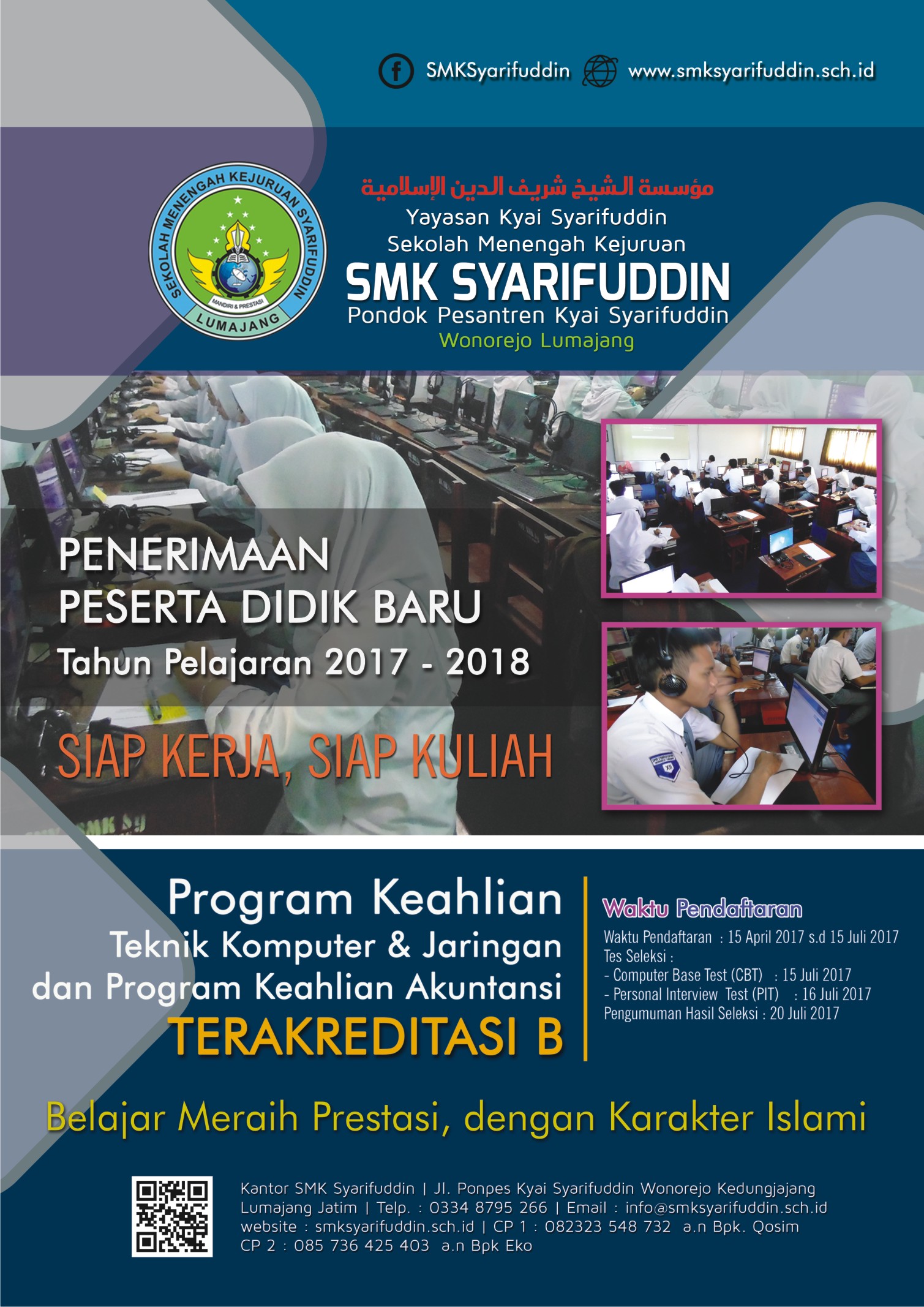 Penerimaan Peserta didik baru (PPDB) SMK Syarifuddin resmi dibuka 15 april kemaren, dan diproyeksikan akan mendapatkan siswa baru lebih dari 100 dari dua kompetensi keahlian, Sebagaimana yang disampaikan oleh ketua PPDB Bapak Eko Hari Cahyono, S.Pd. beliau mengungkapkan bahwa SMK Syarifuddin sangat optmis akan mendapat siswa baru yang sangat banyak, karena saat ini kepercayaan masyarakat kepada SMK Syarifuddin semakin meningkat dengan di beberapa hal: 1. Saat ini SMK Syarifuddin sudah terakreditasi B oleh BAN-SM. 2. SMK Syarifuddin memberlakukan layanan kepada peserta didik berbasis IT, salah satu yang diterapkaan saat ini adalah SIMKA (Sistem Informasi Kurilum SMK). 3. Banyak lembaga satuan pendidikan SLTP/MTs yang memberikan kepercayaan penuh kepada SMK Syatifuddin, dibuktikan dengan dukungan-dukungan yang yang diberikan saat sosialisasi berlangsung, bahkan sebagaian dari satuan pendidikan target sosialisasi meminta agar setiap pelaksanaan PPDB di datangi. Begiu ungkapnya. Untuk informasi PPDB bisa kunjungi Wibsite. www.smksyarifuddin.sch.id atau cp. 085736425403. Acung